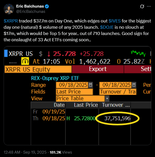 Reacting to the performance, Bloomberg ETF analyst Eric Balchunas called it a ‘good sign’ for the incoming spot XRP ETFs.
