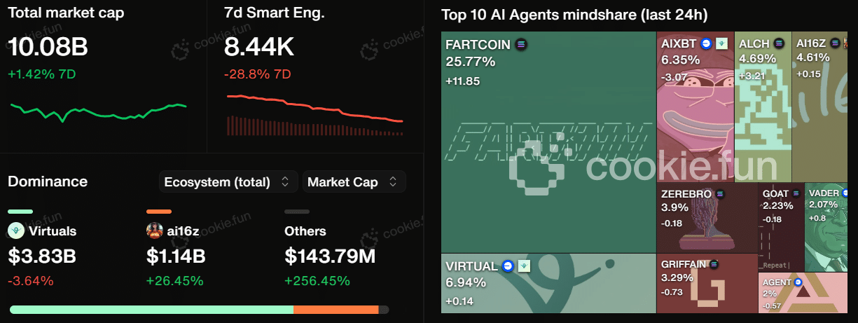 According to Cookie.fun data, the duo controls about half of the total market cap, which was about $10 billion at press time.