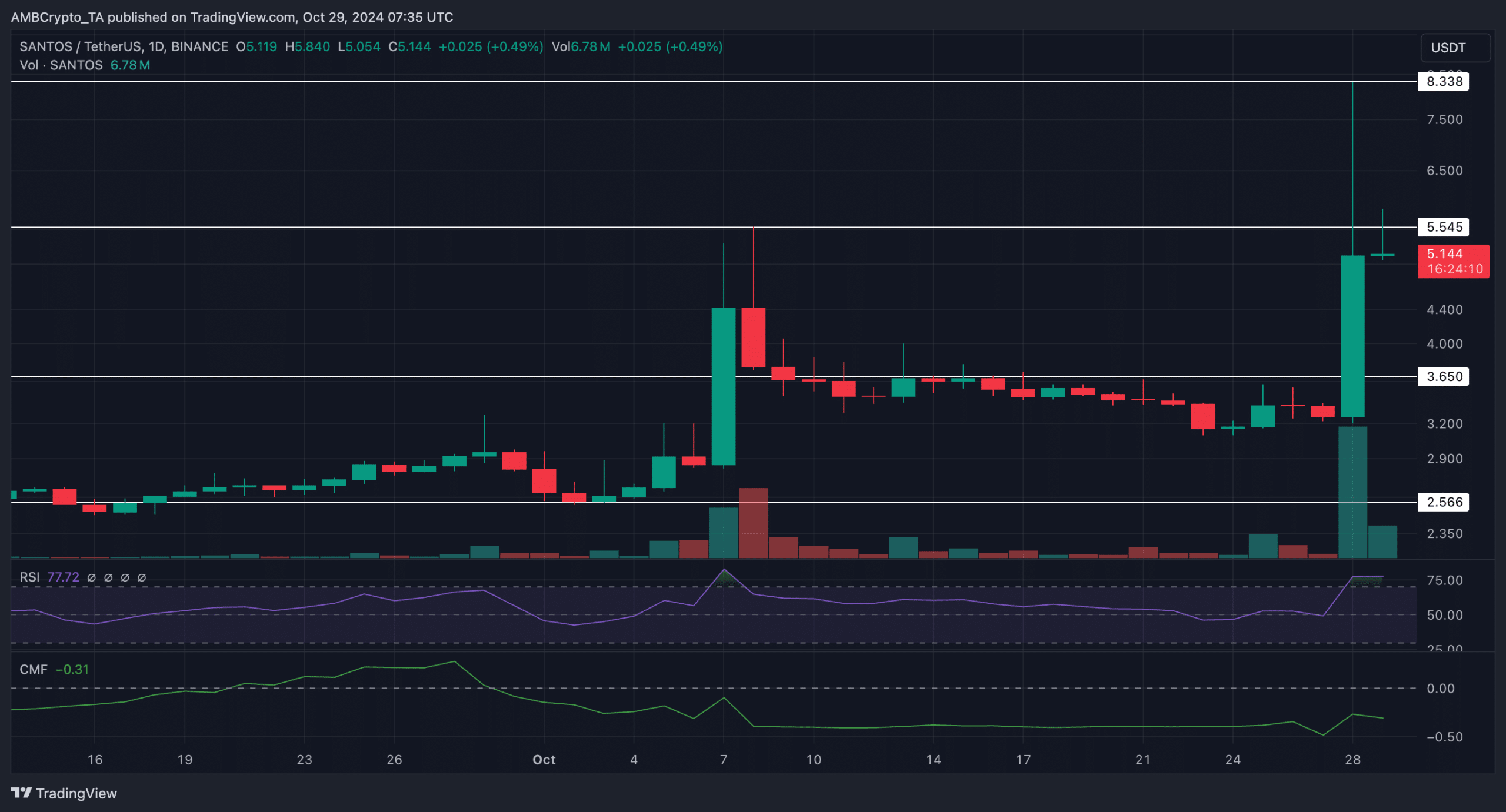 The listing propelled SANTOS to a high of $8.3, its highest price since late March. At the time of writing, the price settled at $5.1.