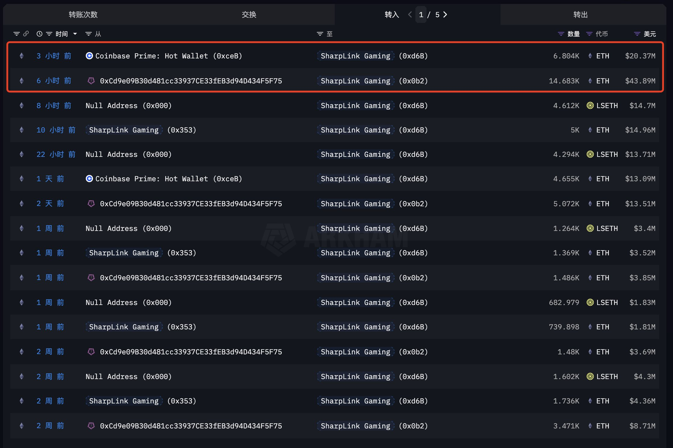 According to blockchain data tracked by EmberCN via Arkham Intelligence, Sharplink acquired 21,487 ETH on July 12, amounting to $64.26 million.