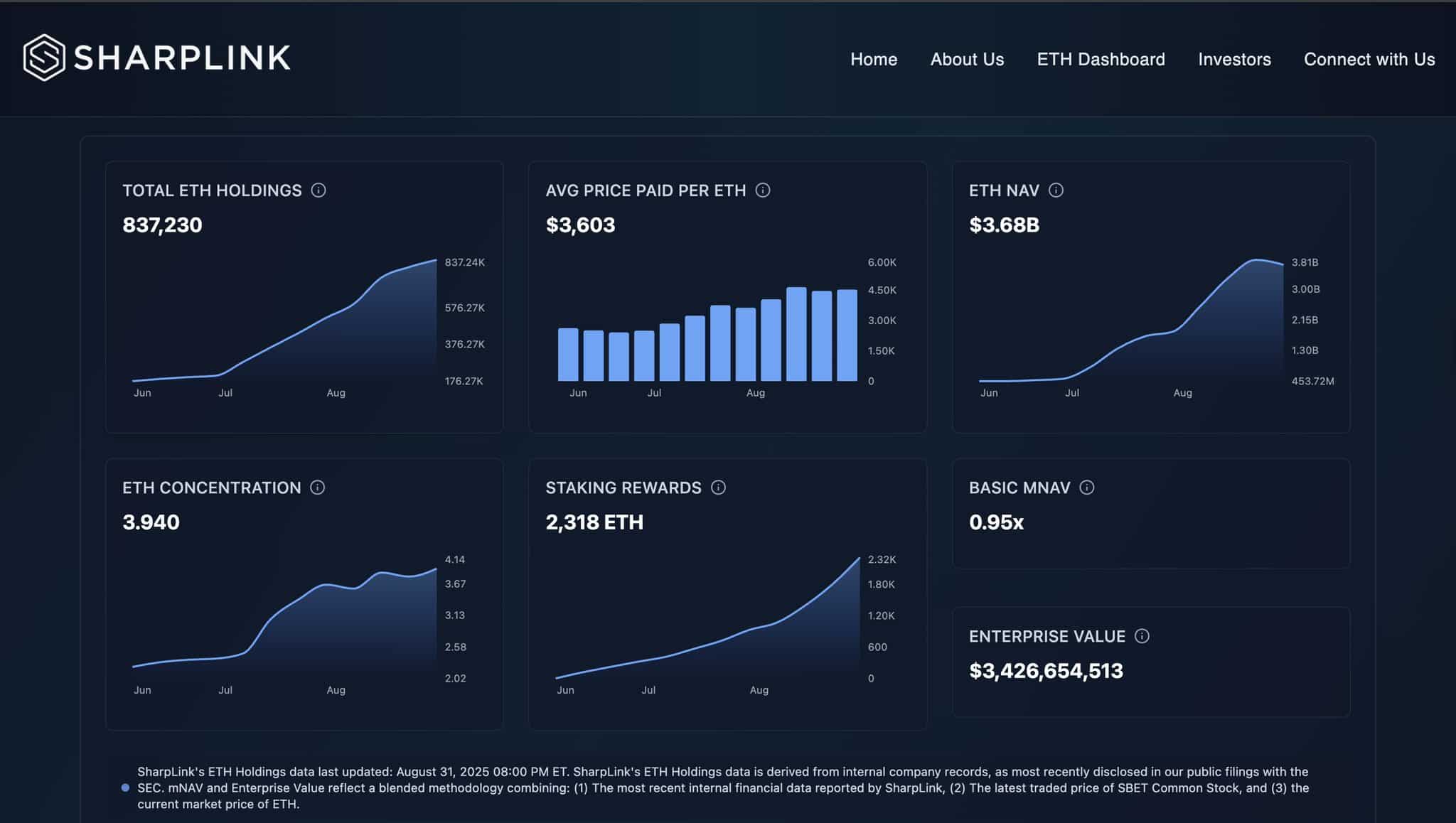 The firm’s concentration of Ethereum has risen by about 97% since early June. From the data on SharpLink Gaming, the company had earned 2,318 ETH in staking rewards, with their ETH NAV at $3.68 billion.