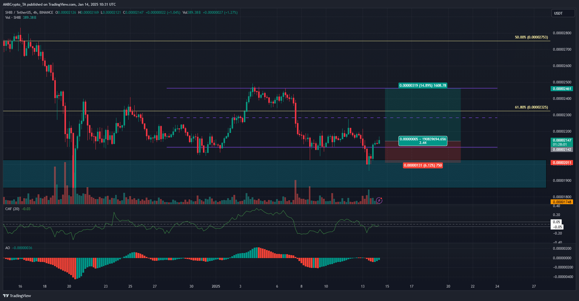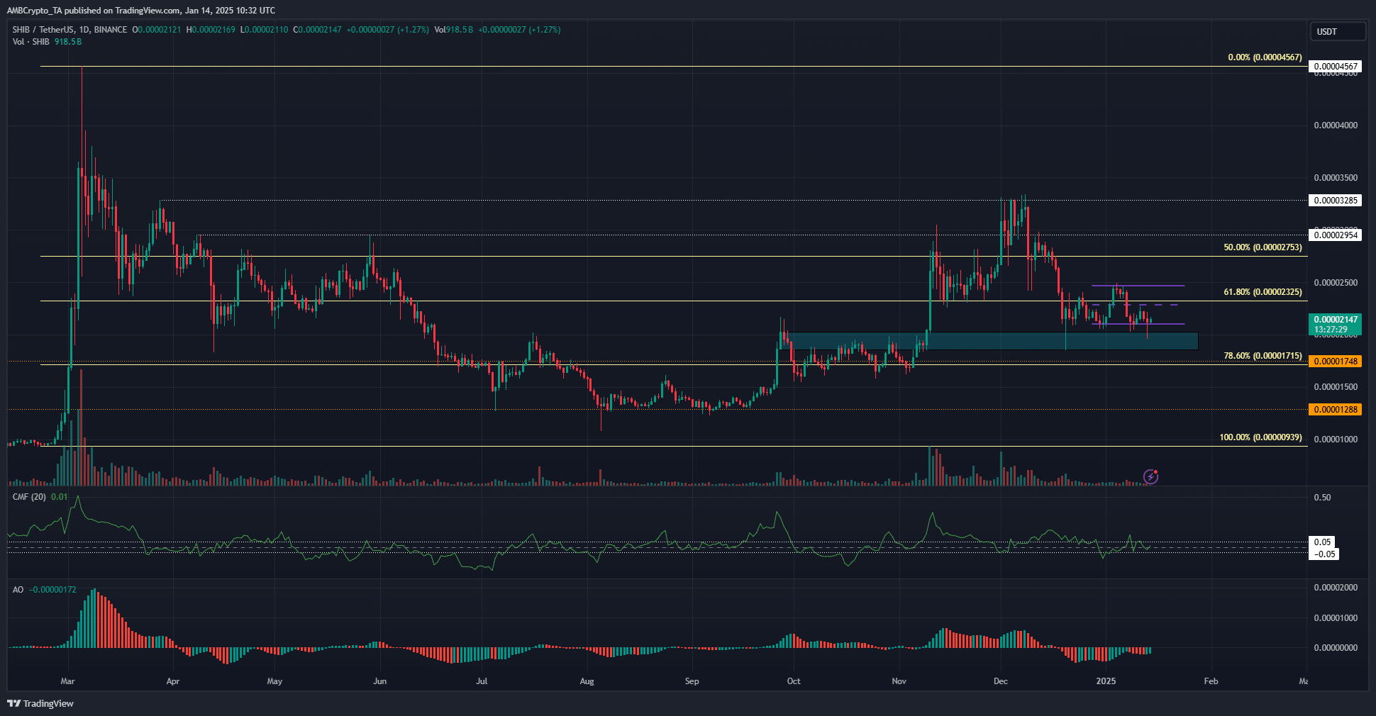 The daily chart revealed that Shiba Inu was on a slow path to recovery after the deep correction in mid-2024. The $0.00002 zone, which had been a resistance before November, remained a support zone at press time.