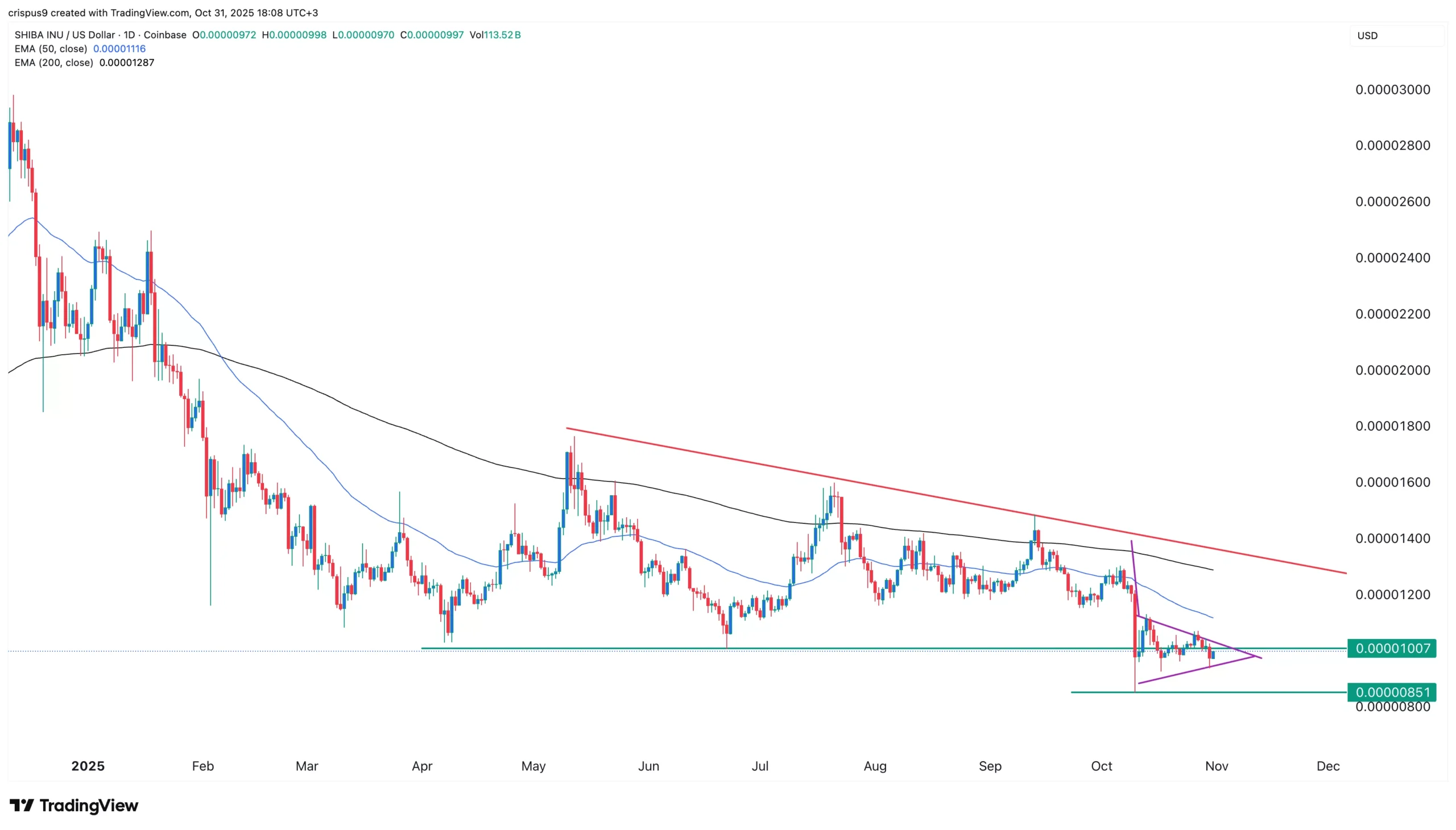 Shiba Inu (SHIB) token dropped to $0.0000099, down by 43% from its highest point this year and 70% below its November 2024 high.
