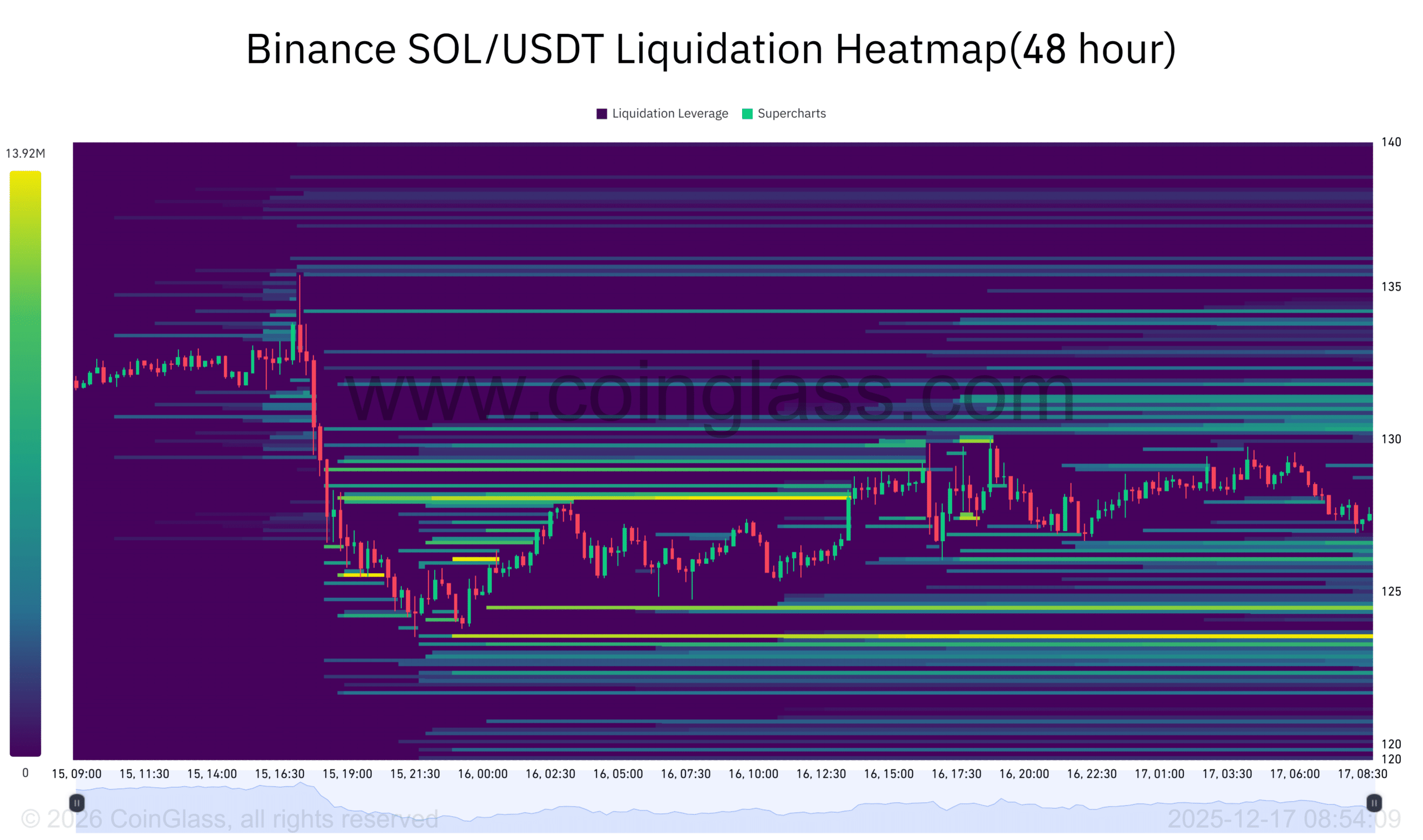 Binance Liquidation Heatmap highlighted dense liquidity clusters around the $123 level. That zone increased the probability of a short-term sweep during continued weakness.