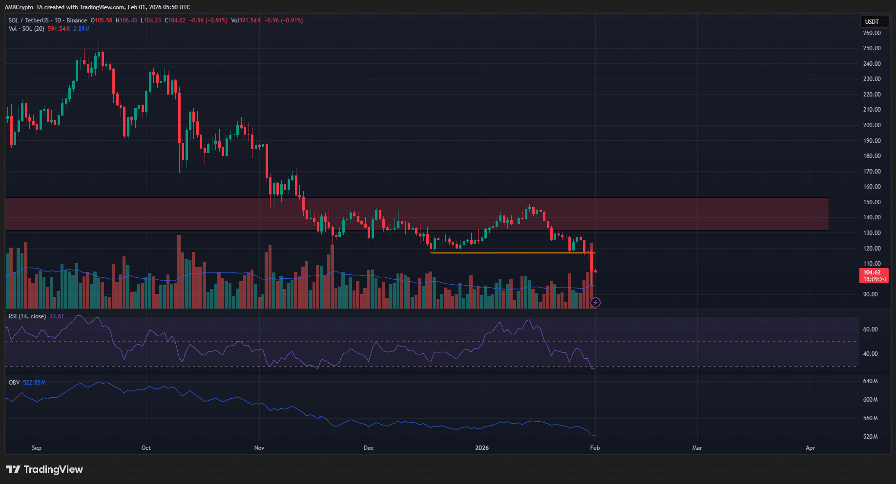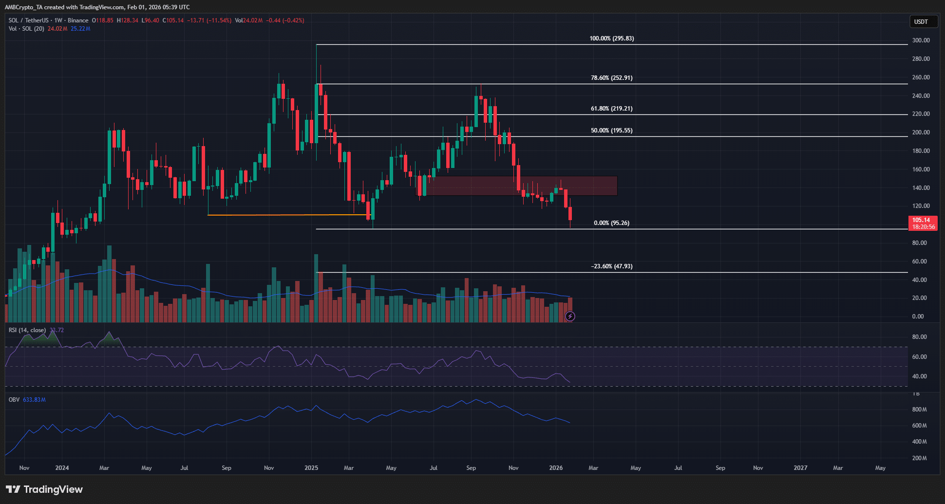 At the time of writing, it appeared highly likely that SOL would fall below the $95 swing low from April 2025.