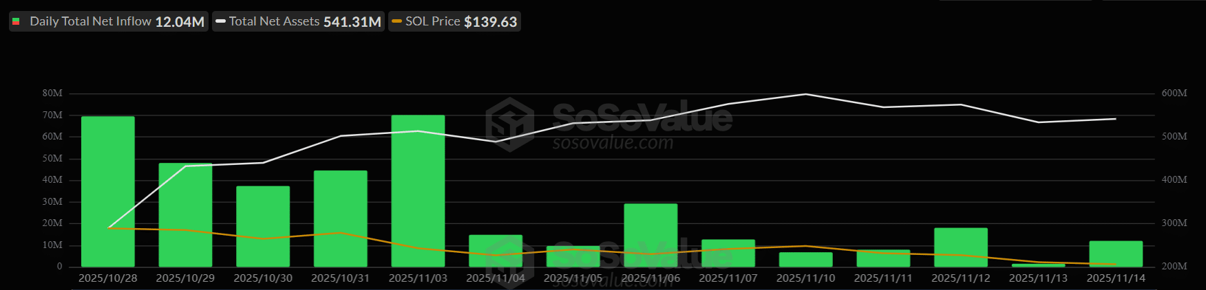 SOL ETFs logged multiple inflow peaks above $60 million, keeping total assets near $541 million.