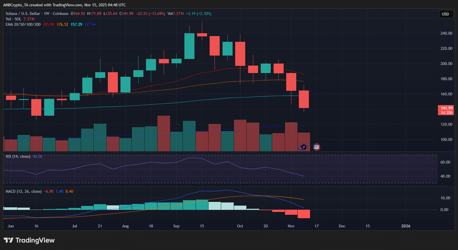 That strength from ETF flows contrasts with SOL’s weekly chart, where price momentum continues to deteriorate.