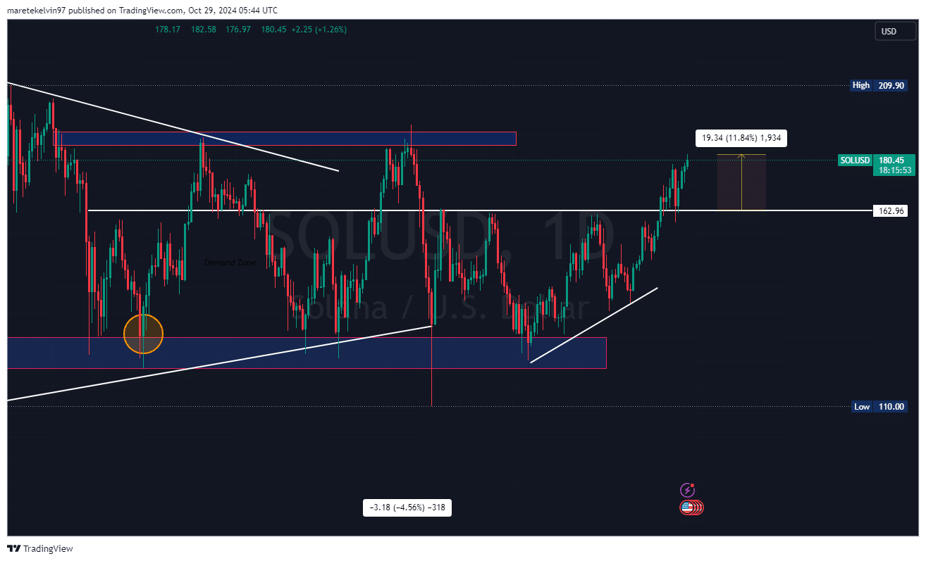 Solana [SOL] has shown remarkable resilience after successfully defending the critical support zone at $162. The latest charts indicate an 11% surge since the altcoin retested the key support level at $66.5. SOL was trading at $180.45 at press time.
