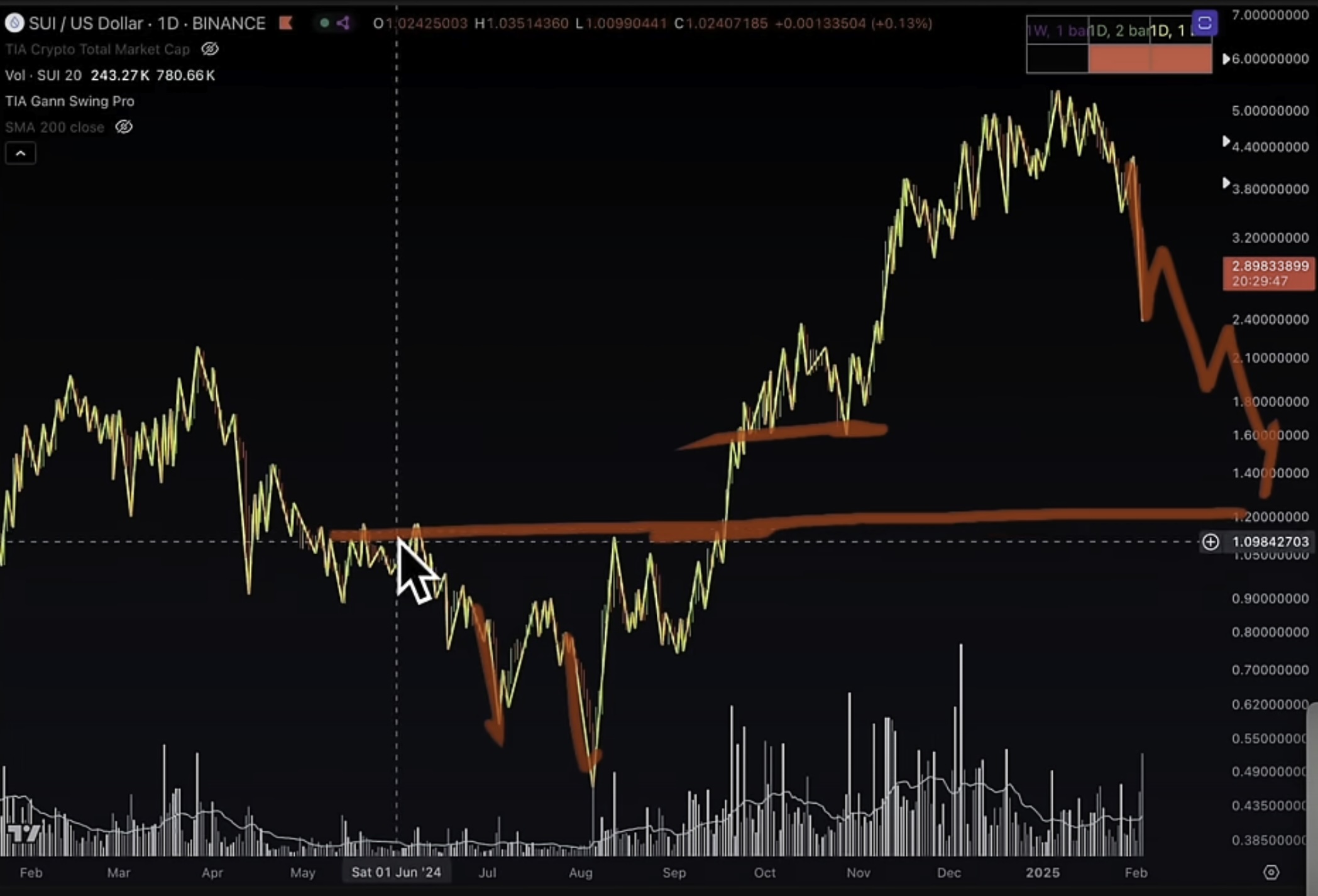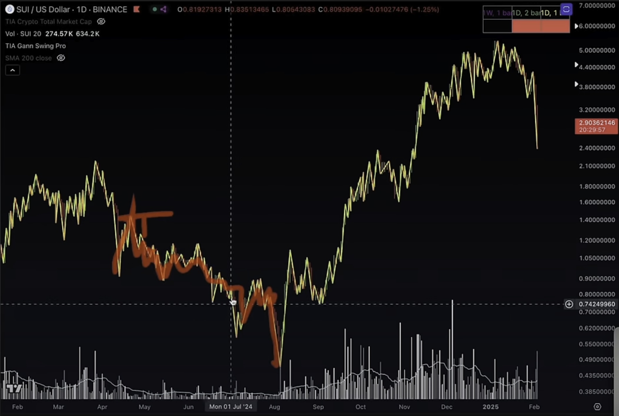 He says if Sui cannot hold $2 as support on the daily chart it may dip to $1.60 or even lower, which would be in line with the 2024 pattern.
