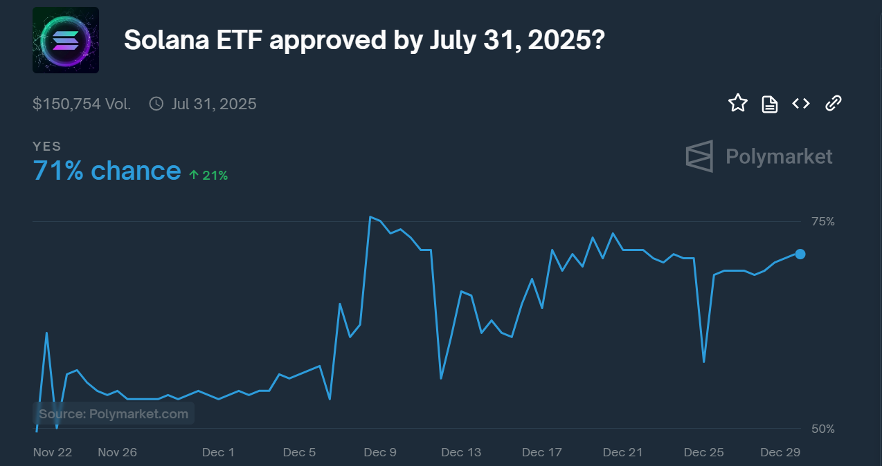 Interestingly, since Christmas Day, the market became more bullish on SOL ETF approval by July 2025, as illustrated by Polymarket odds soaring from 58% to 71%.
