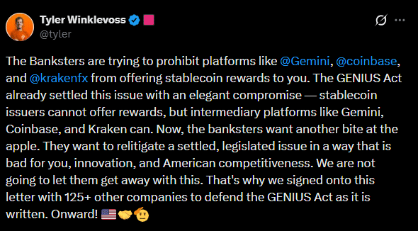 Reacting to a collective industry letter to Congress to defend the stablecoin law GENIUS Act, Winklevoss stated,