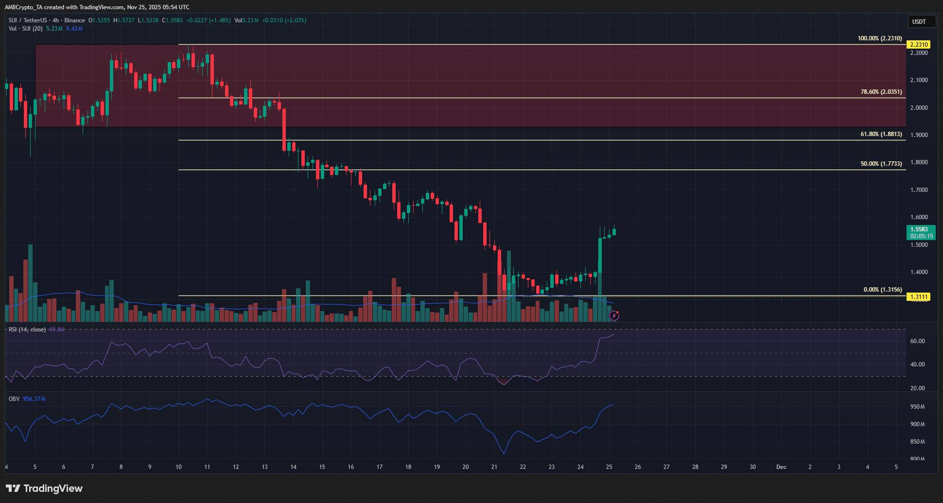 The 1-day chart showed that the RSI had dropped to 22.15 on the 22nd of November. Since then, SUI has rallied by 15.7%.
