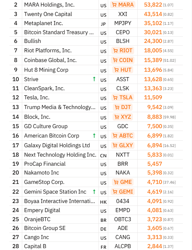 Top Bitcoin treasury firms by total BTC holdings. Source: Bitcointreasuries.net