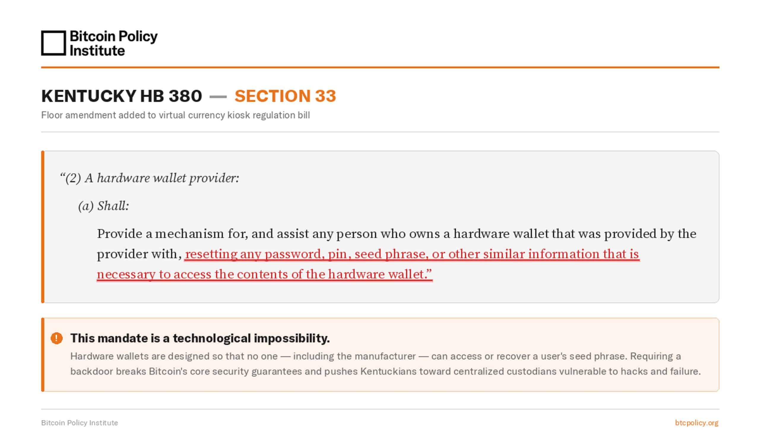 BPI has just learned of an amendment buried in Kentucky HB 380 that would require hardware wallet providers to reset users’ seed phrases on request. This would effectively outlaw self-custody in Kentucky.