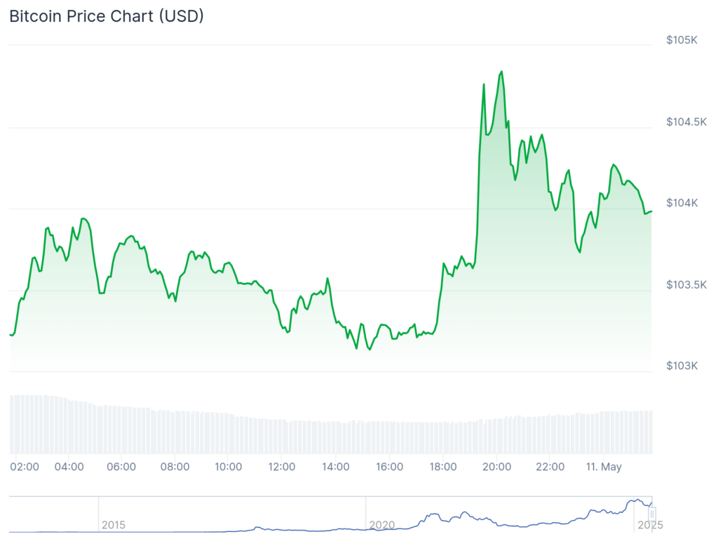 Bitcoin (BTC) climbed to a peak of $104,900 on Saturday evening—just about 4% below its all-time high—following President Donald Trump’s announcement of progress in U.S.-China trade talks during a meeting in Switzerland.