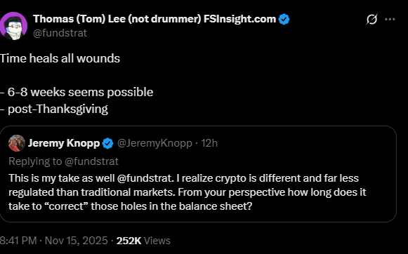 But Fundstrat’s CIO and Bitmine Immersion Chair, Tom Lee, projected that the crypto market weakness is short-term and could rebound soon.