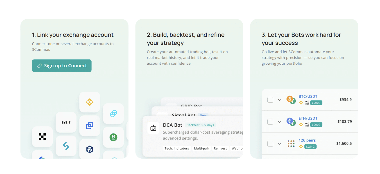 3Commas ranks second because it is still one of the most complete multi-exchange bot platforms for users who want more than a single preset strategy. It is strong for traders who want to connect exchange accounts, automate execution, and keep one control layer across multiple venues. Compared with MoneyFlare, it demands more setup. Compared with simpler exchange-native bots, it offers more room to build a trading workflow that actually grows with the user.