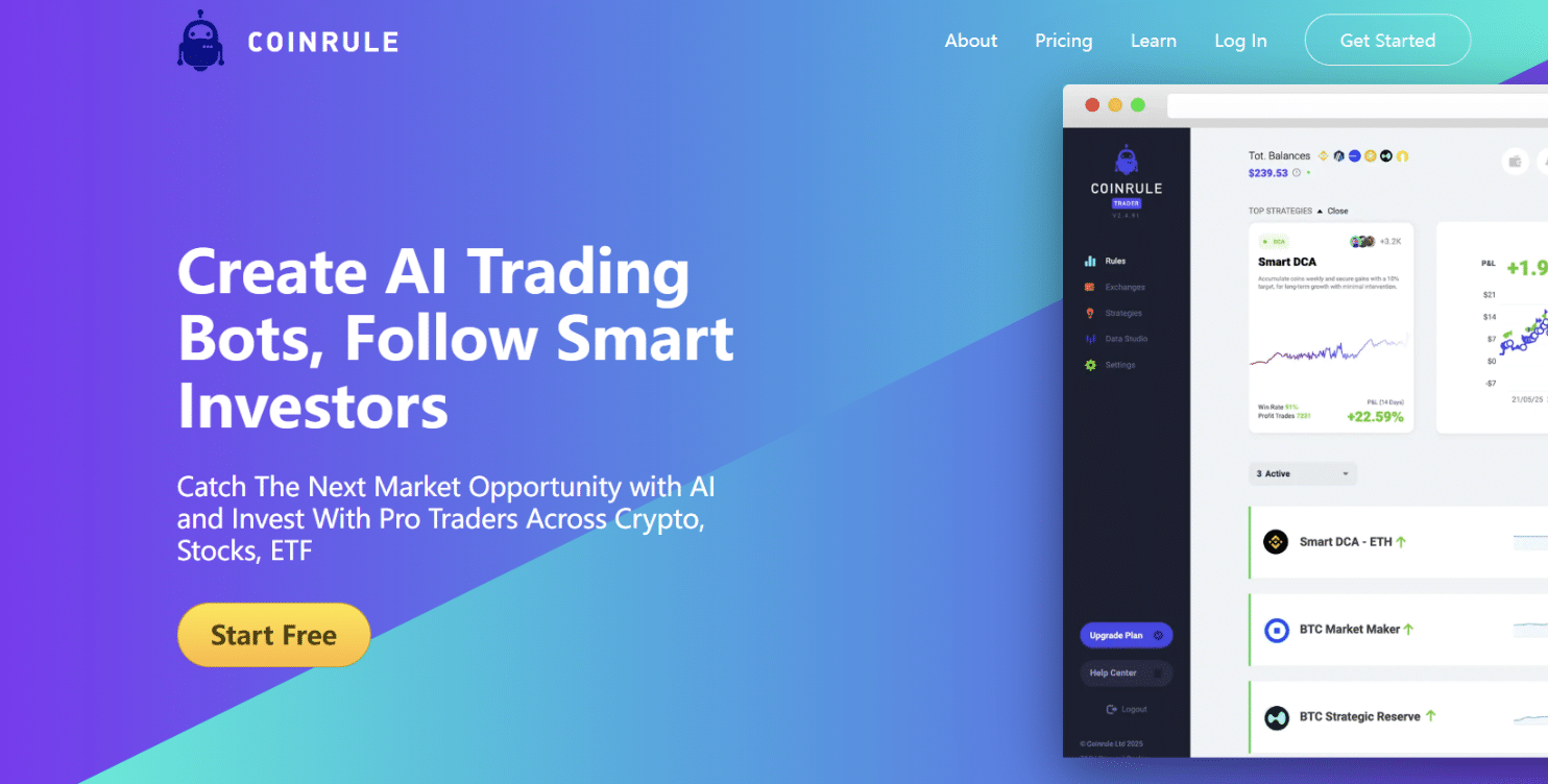 These platforms let users define logic without programming. Coinrule is a classic rules-first example, while Cryptohopper blends strategy customization with AI-driven positioning.