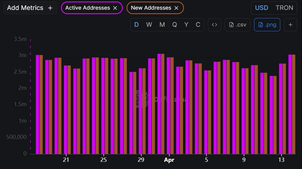 On the network side, Tron has recorded a significant surge in usage, and Justin Sun’s announcement seems to have attracted more users. According to Defillama data, Tron’s Active Addresses surged to a two-week high of 3.04 million on the 15th of April. This marked a significant jump from 2.7 million the previous day.