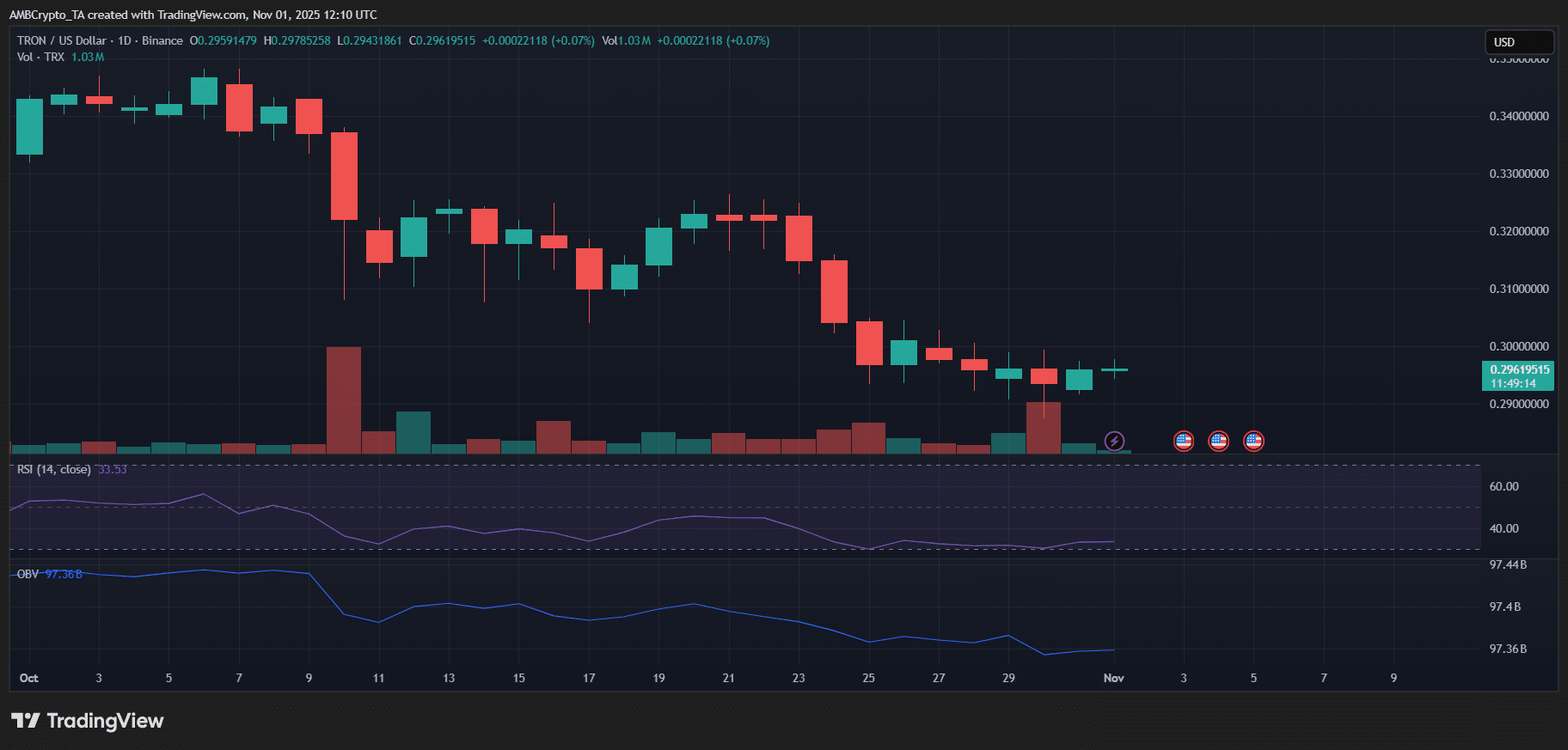 Price traded near $0.29 at press time, without any real breakout attempt yet. The RSI was close to oversold, but did not show a strong reversal push. OBV had also been sliding, so volume did not back the upside cases.