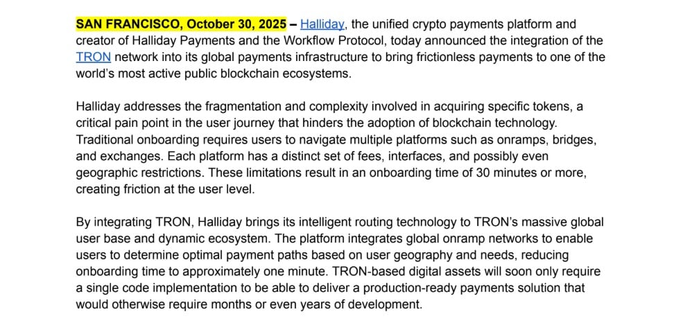 Adding to the bullish outlook, Halliday’s recent integration now allows users to onboard to Tron in under 60 seconds.