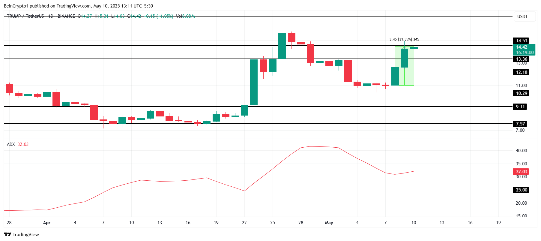 The ADX (Average Directional Index) shows that the bullish sentiment surrounding OFFICIAL TRUMP has not lost its strength, despite recent volatility.