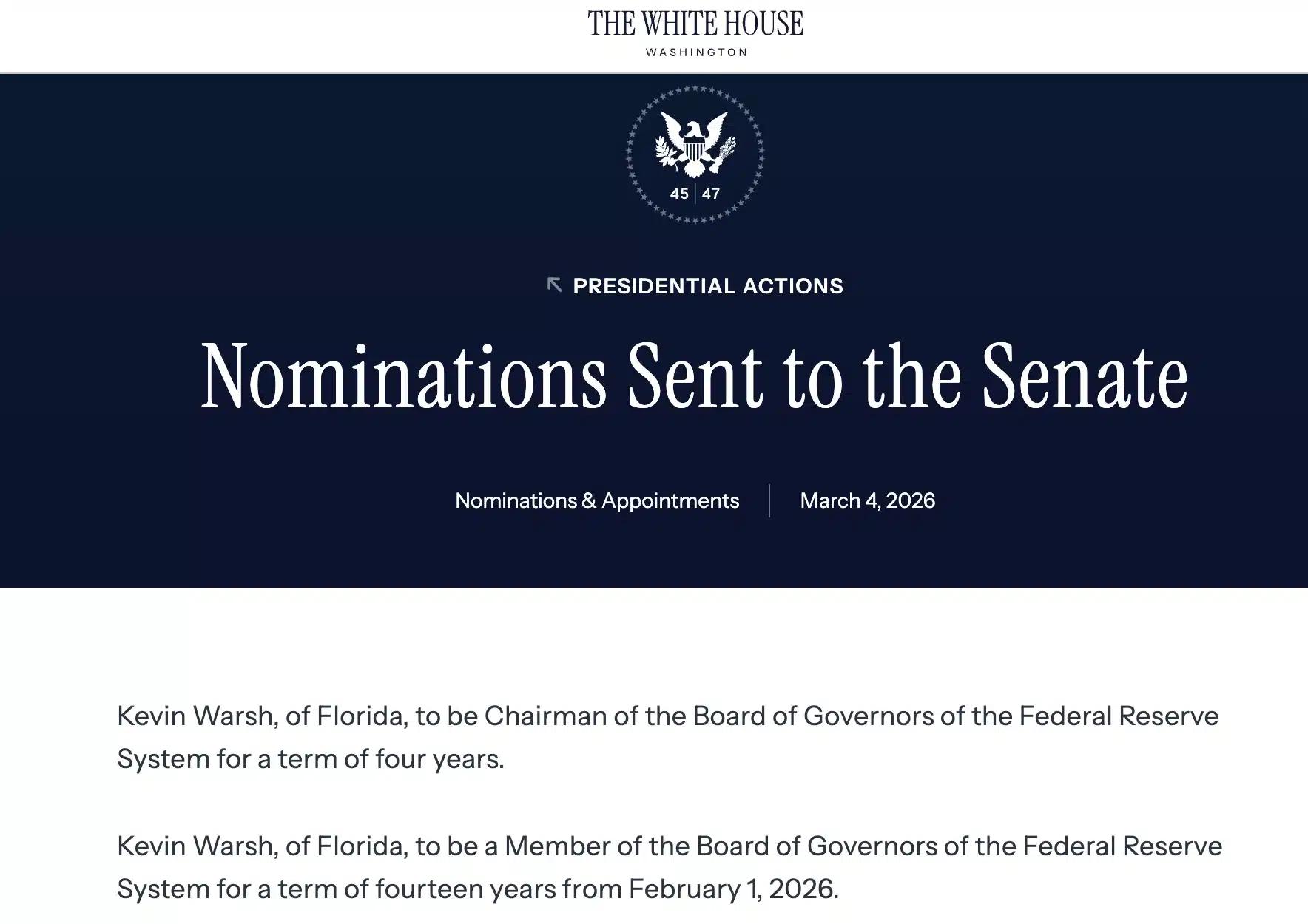 The White House sent the nomination to the Senate on the 4th of March, potentially ending a long-running clash between Trump and Powell.