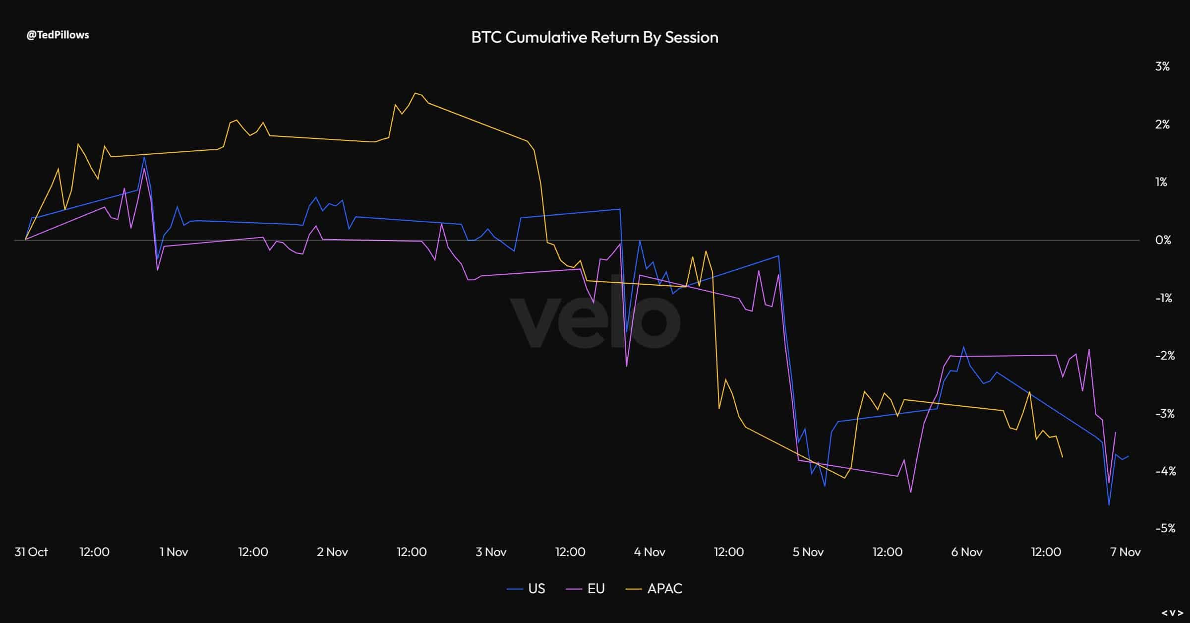 Over the past week, Bitcoin’s Cumulative Return By Session fell from roughly +3% to -4%, reflecting growing bearish momentum.