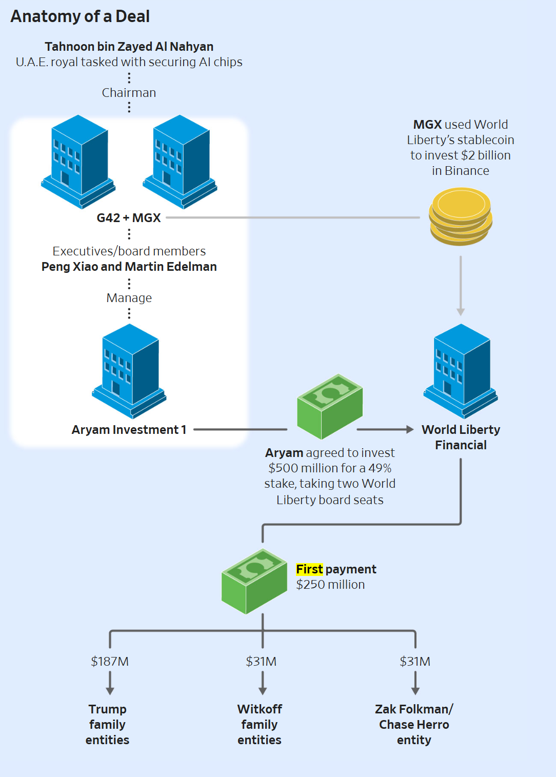 The Journal reported that executives from G42 helped manage Aryam Investment 1 and took board seats at World Liberty as part of the deal, making Aryam the startup’s largest outside shareholder. Weeks before the US-UAE chip framework was announced, another Tahnoon-led firm, MGX, used World Liberty’s stablecoin to complete a $2 billion investment into Binance.