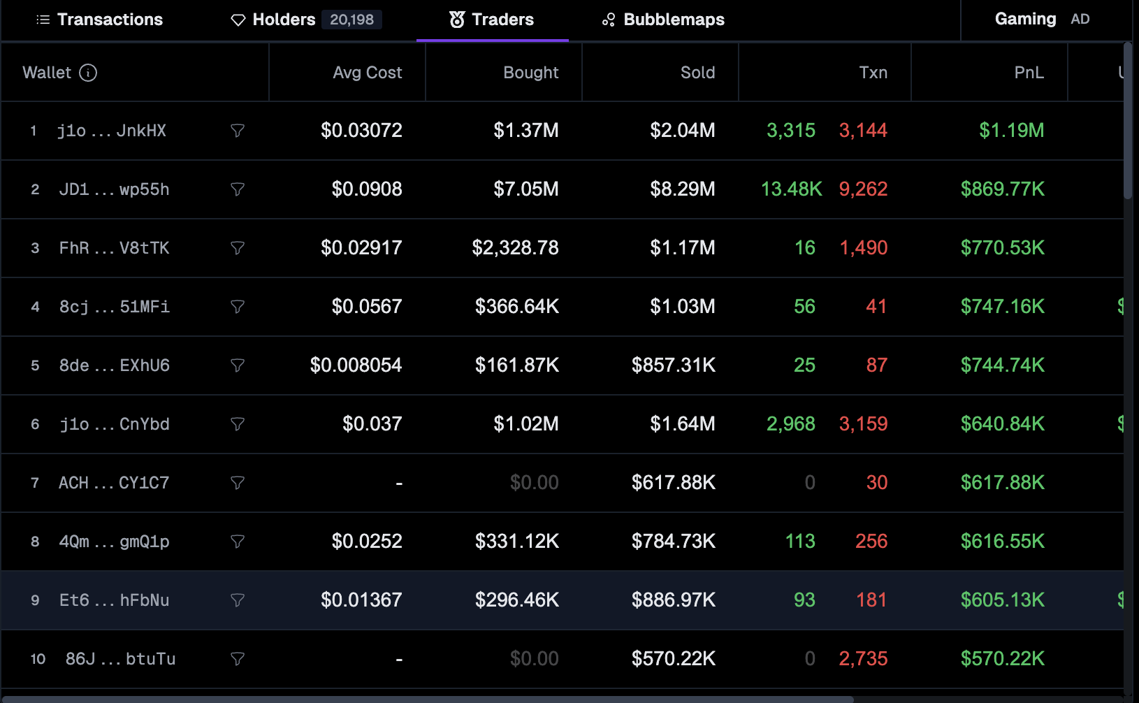 According to the GeckoTerminal Traders tab, 9 of the top 10 wallets are deep in the green. One address has flipped over $1.19 million in realized gains, with another clocking $869,000, and so on down the list. Even wallets that didn’t start big have turned five-figure buys into monster flips.