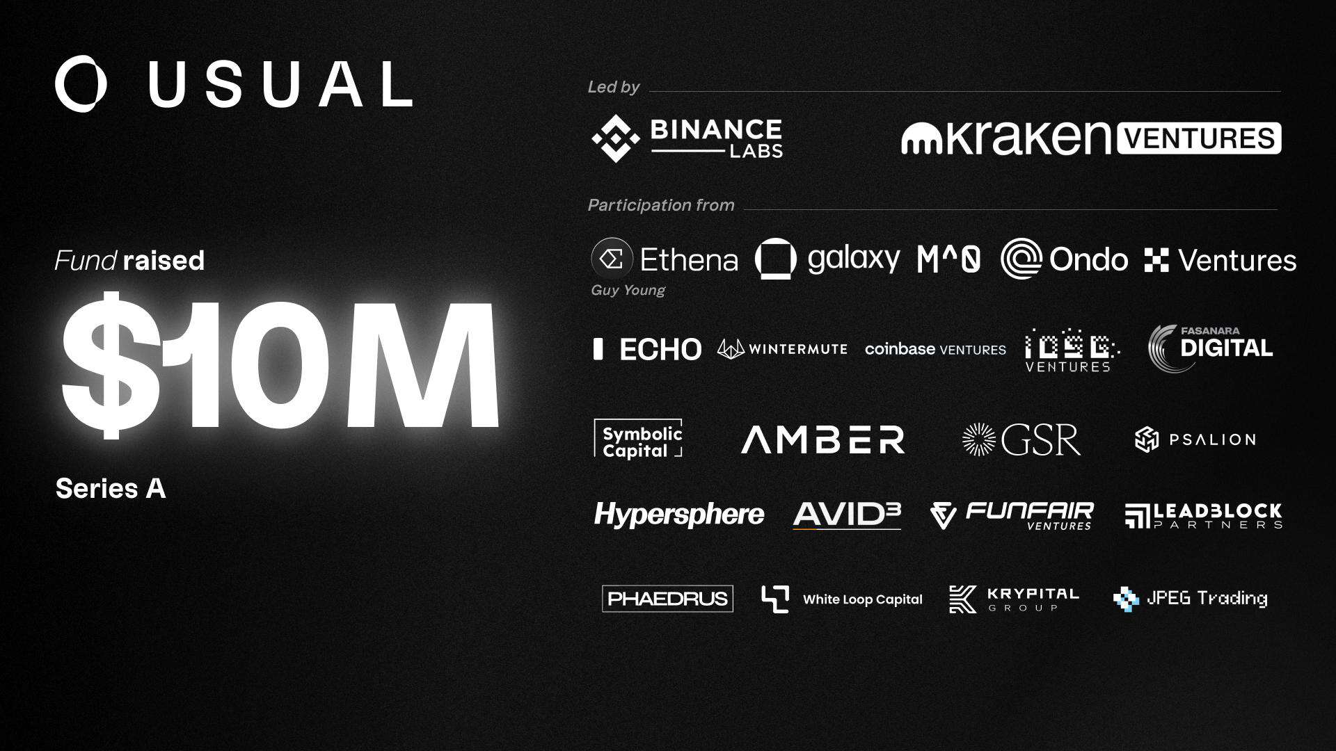 Usual, the decentralized stablecoin protocol, announces a $10M Series A funding round led by Binance Labs and Kraken Ventures, with participation from Galaxy Ventures, Guy from Ethena, Ondo, Coinbase Ventures, IOSG Ventures, OKX Ventures, Wintermute, Echo, Fasanara Digital, Symbolic Capital, Amber, GSR, Psalion, Hypersphere Ventures, Avid3, FunFair Ventures, Leadblock Partners, Phaedrus, JPEG Trading, White Loop Capital, and Krypital.
