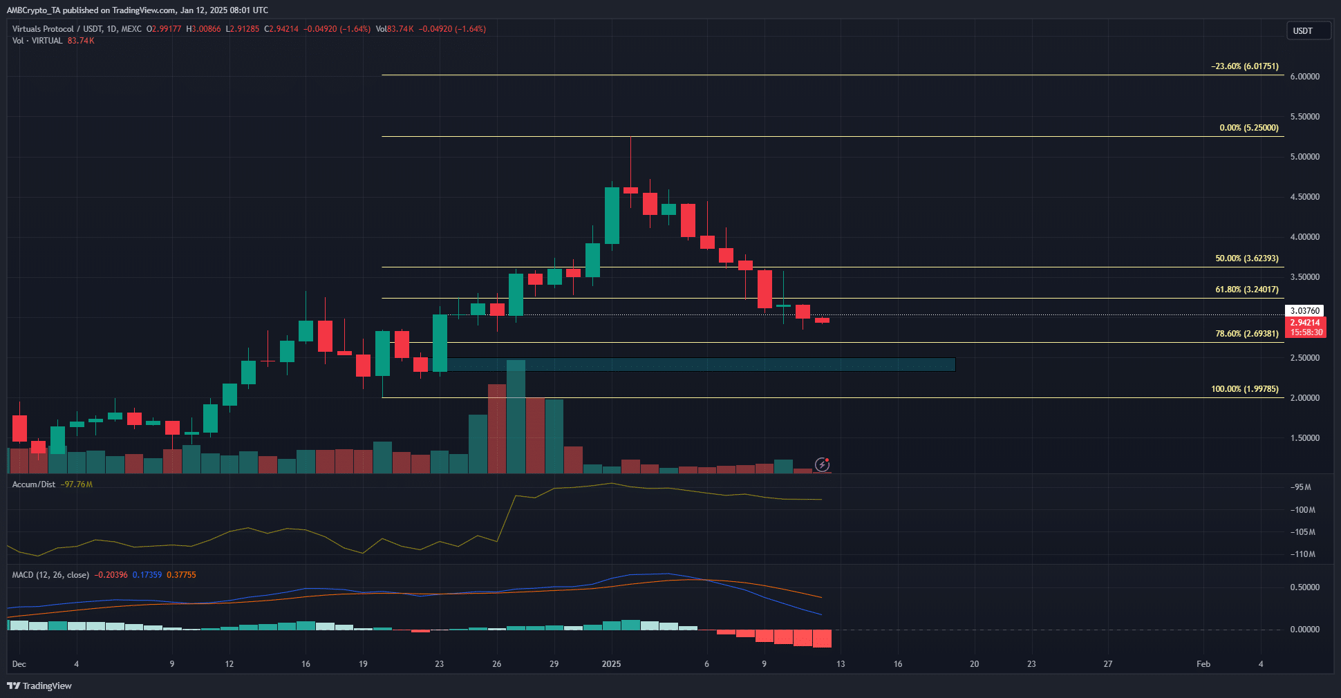 The price of the token has been falling lower each day since 02 January, with just two green days. While the trading volume was much reduced compared to the rally that took VIRTUAL to $5.25, the losses were still significant.