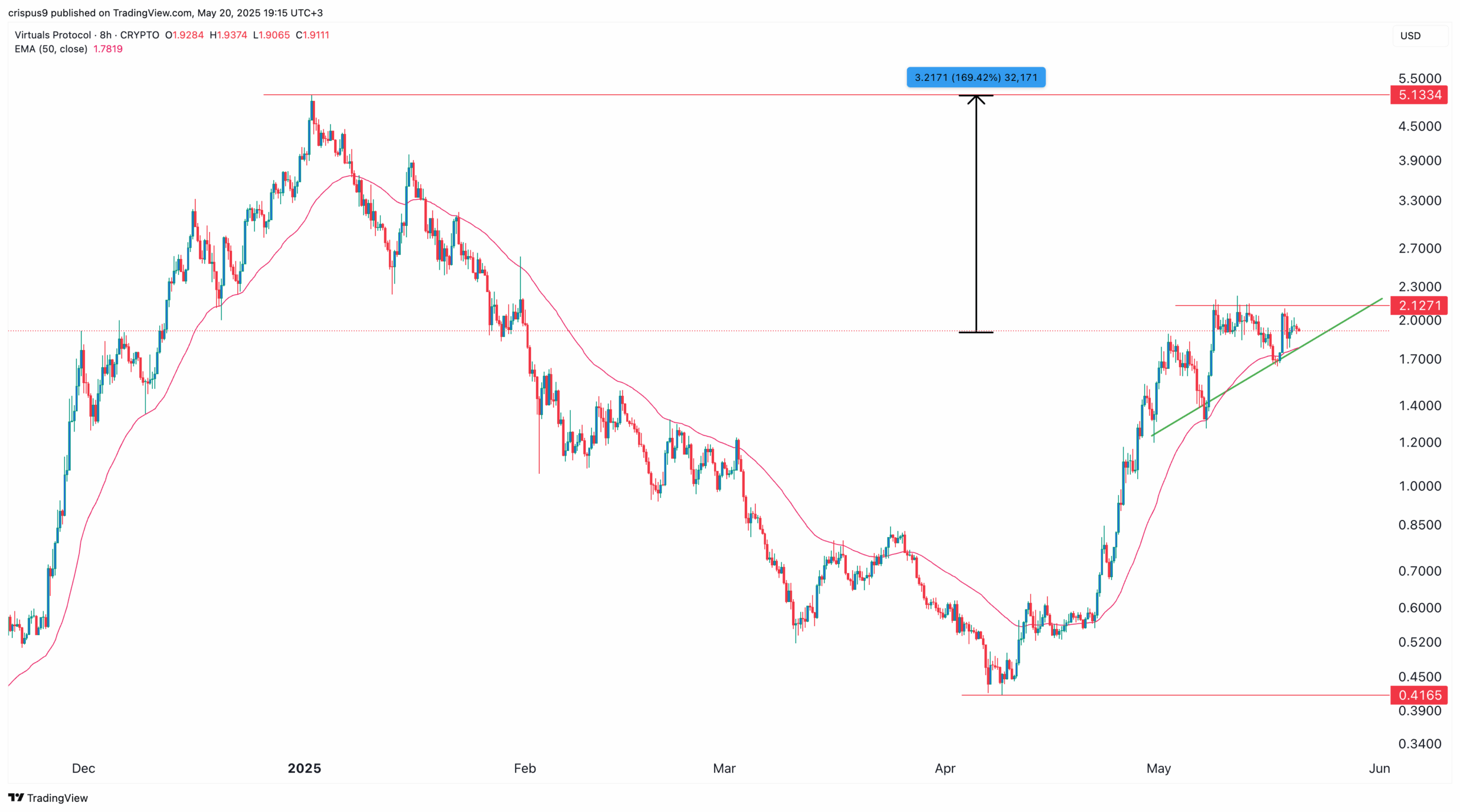 The eight-hour chart shows that VIRTUAL has been in an uptrend over the past few weeks, climbing from a low of $0.4165 in April to $2.20 this month.
