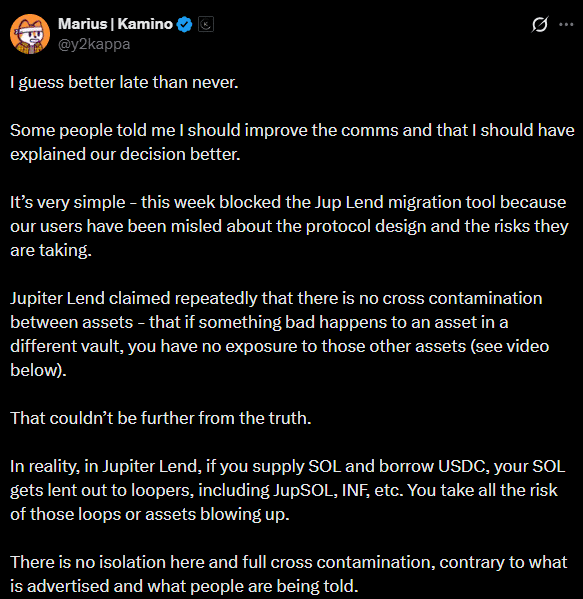 For him, this meant “misleading users” and denting trust. As a result, Marius said Kamino blocked a migration tool to Jupiter Lend to mitigate the risk.