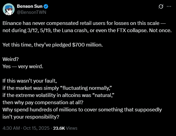 While Binance denied responsibility for the crash, its massive repayment sparked debate. One critic, Benson Sun of Coin Karma, questioned