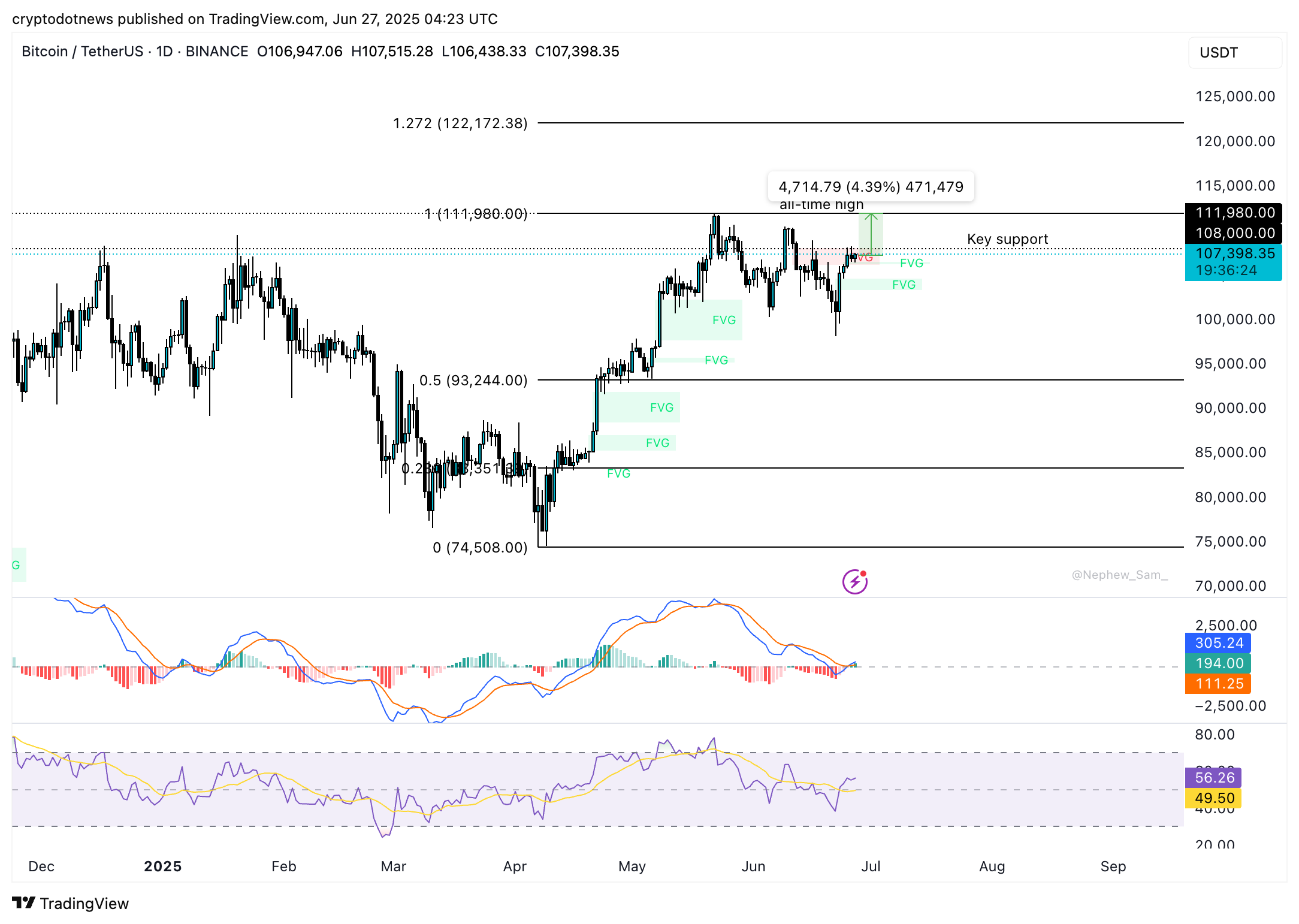 On the BTC/USDT daily price chart key support levels are $106,290, $104,600 and $103,000. Resistance levels are the all-time high at $111,980 and the 127.2% Fibonacci retracement level at $122,172.