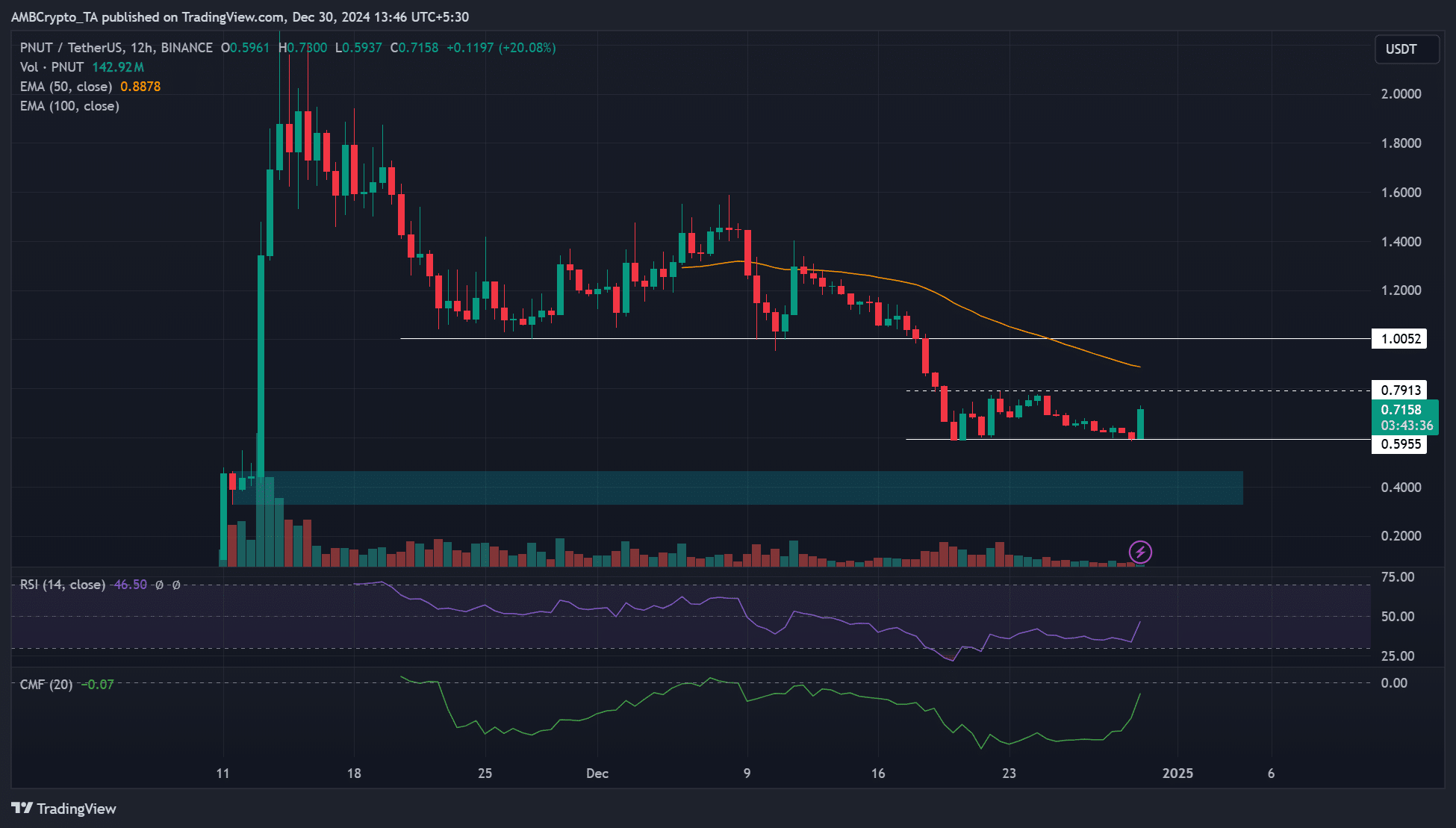 Following the whale’s move, PNUT bounced from the $0.6 short-term support and pumped 20% in the past 24 hours. After the hype during the U.S. elections in November, PNUT peaked at $2.5 and dumped over 75%.