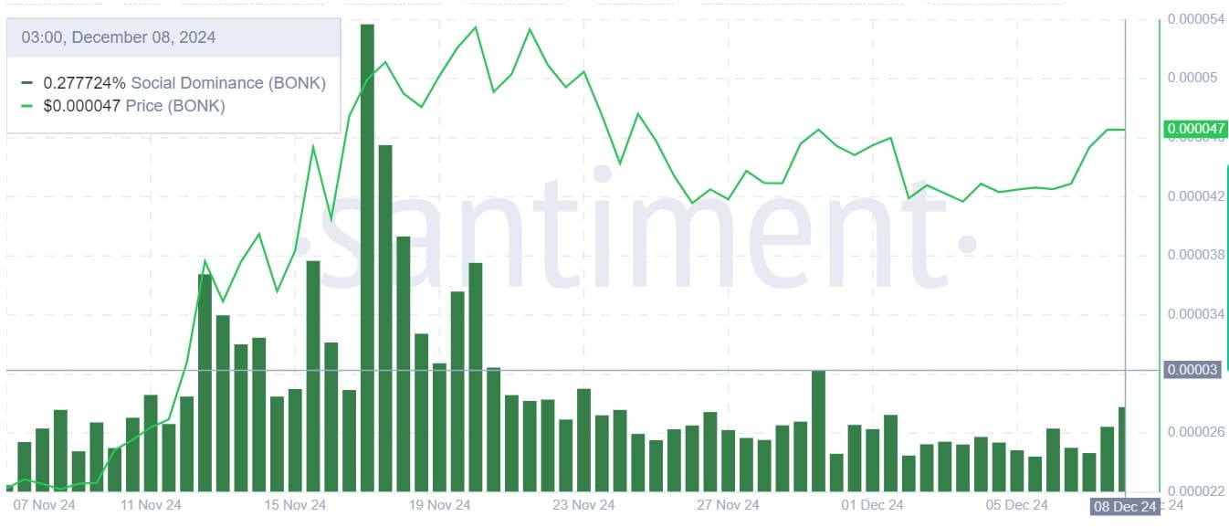 Despite the price pump, Bonk remains approximately 20.79% below its ATH recorded 18 days ago.