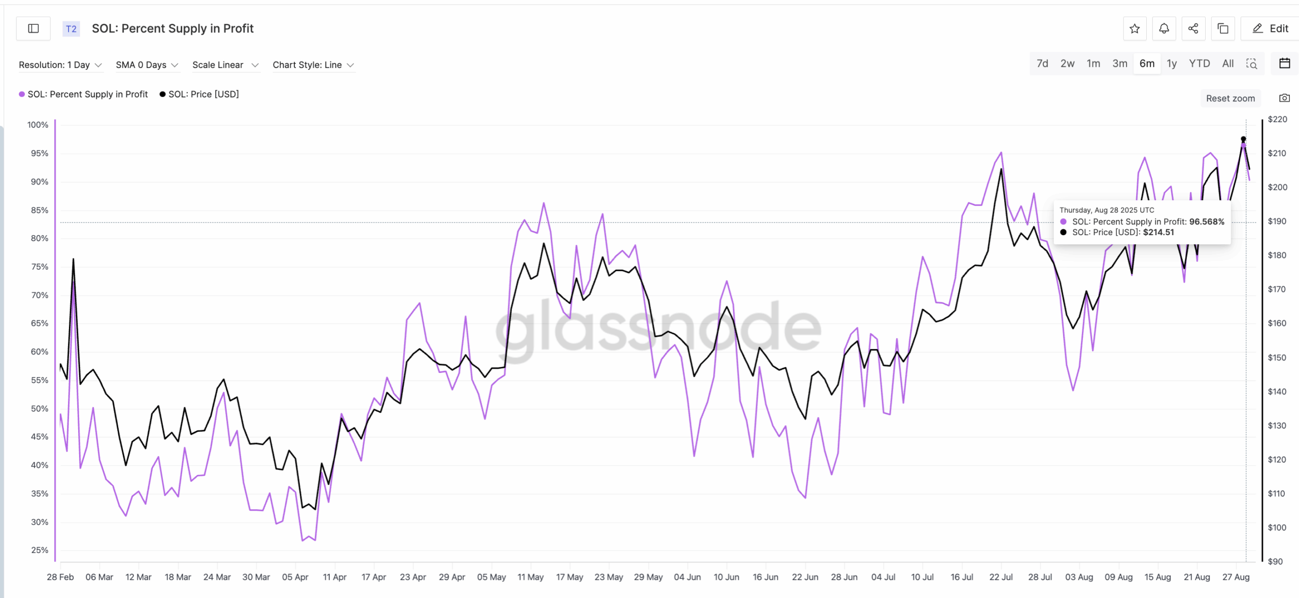 History shows that such highs often precede corrections in the Solana price. On July 13, the metric touched 96% while the Solana price traded around $205, followed by a 23% drop to $158.