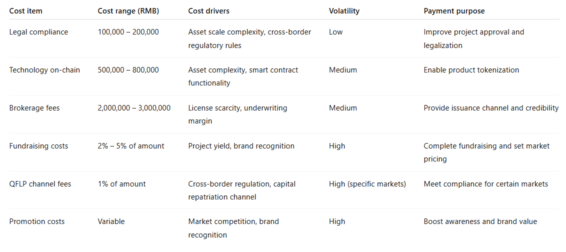 Brokerage fees take the largest share, while blockchain integration and legal compliance add further expenses. Additional charges for fundraising, cross-border approvals, and promotion increase the total burden.