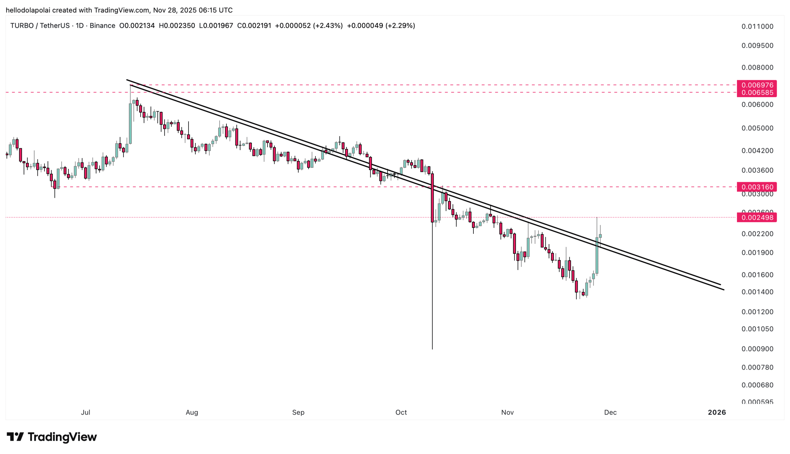 If Turbo clears these bearish pressure zones, the move would likely trigger a rally toward the chart’s local high of $0.006976. From the first resistance level, this would represent a total upside of approximately 180%.
