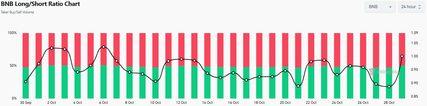 The 1-day timeframe price chart revealed that while BNB had a bullish swing structure, it also had a bearish short-term bias over the past ten days. This was due to the bulls’ inability to defend the swing low at $1,100 on 17 October.