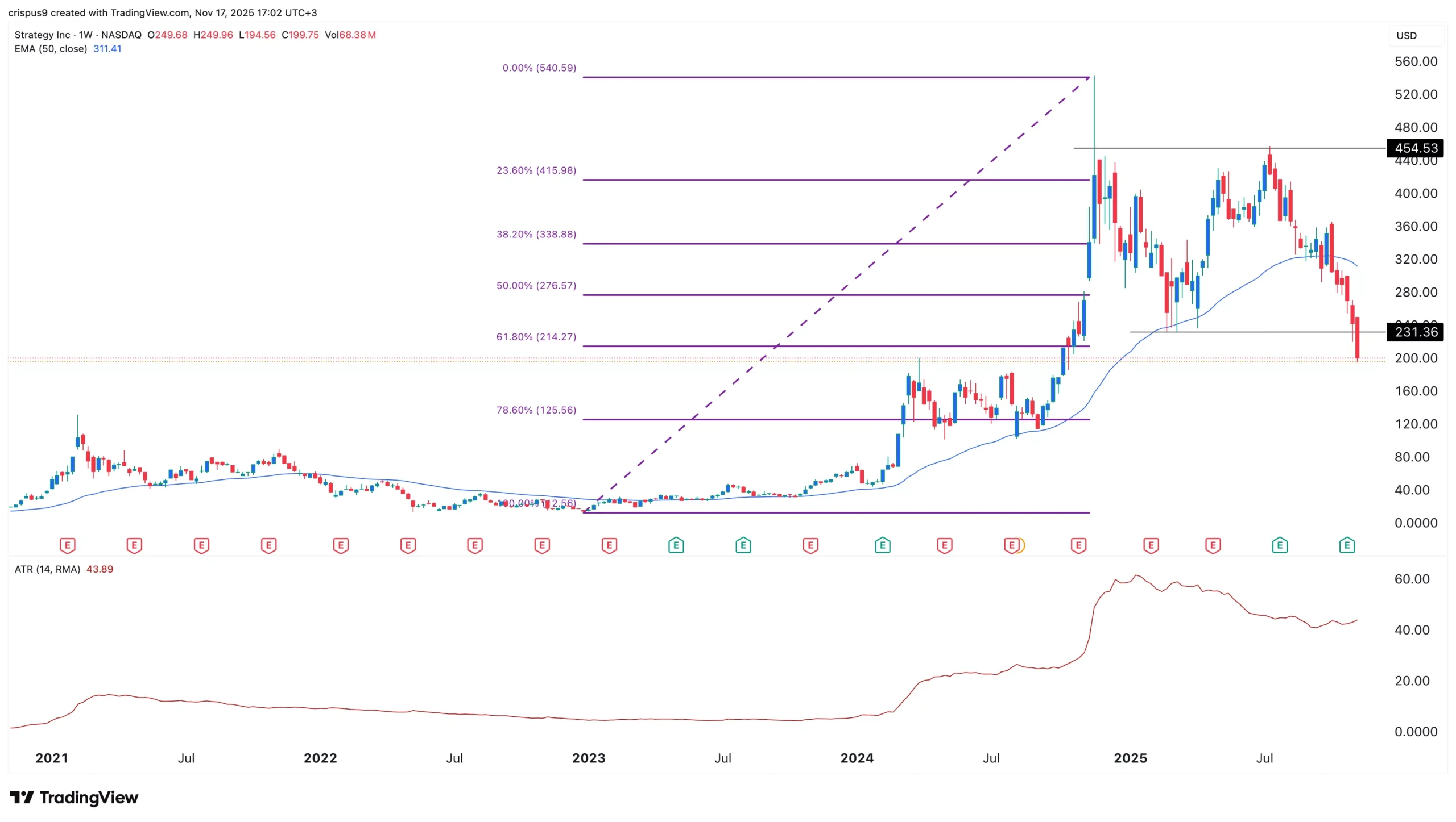Strategy stock has plunged below the important 61.8% Fibonacci Retracement level at $214, confirming the bearish outlook.