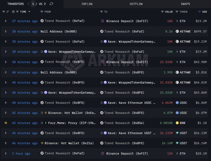 Over the last few days, Trend Research had deposited large ETH batches into Binance, using the proceeds to pay down their Aave loans. This strategy added considerable sell-side pressure, worsening market momentum. As they neared critical health factor thresholds, the urgency of their actions increased.