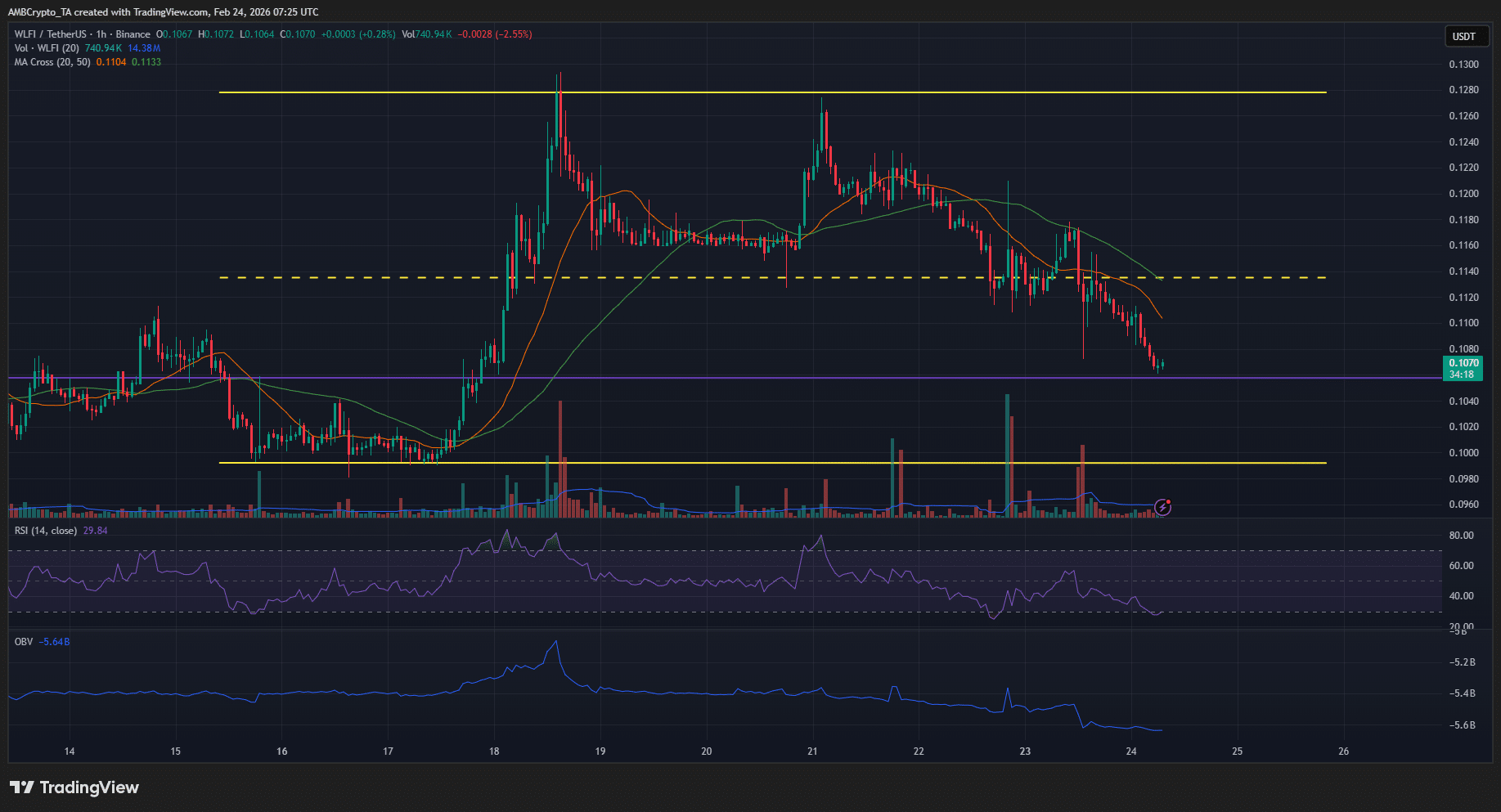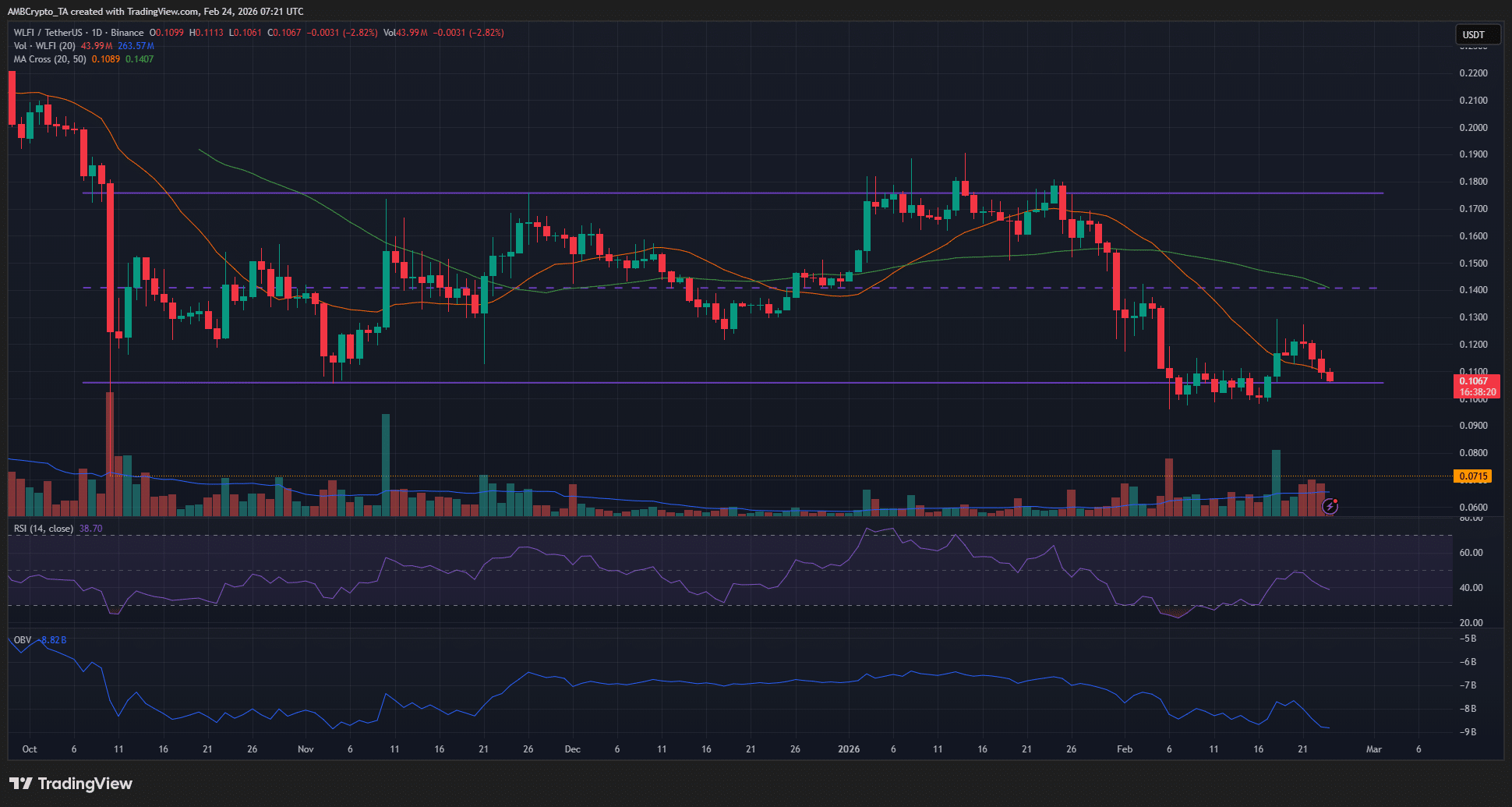 World Liberty Financial [WLFI] formed a top around the $0.18 supply zone in late December. Since then, it has faced steady distribution, and the price was back at the $0.106 long-term support.