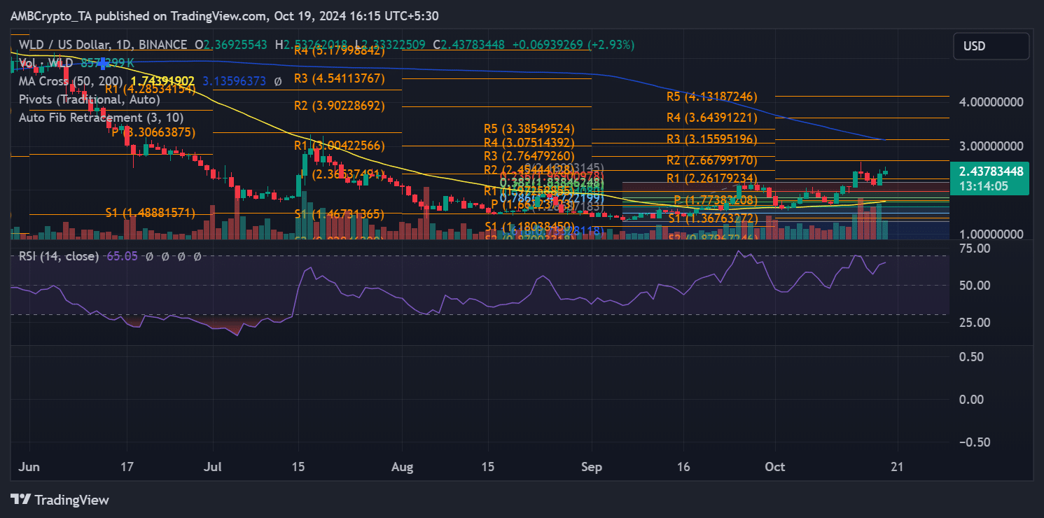- WLD’s RSI stood at 65.05, nearing overbought territory – A sign of potential caution for traders