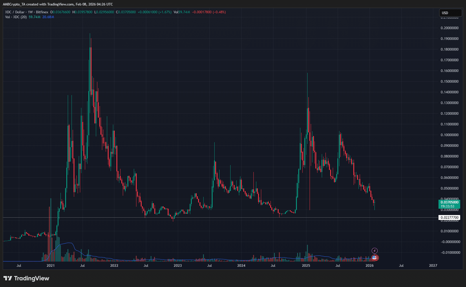 A retest of $0.0227 is likely to be followed by a consolidation phase where the price could form a range below $0.03. Once such a range is established, long-term investors can look to buy and hold XDC once more.