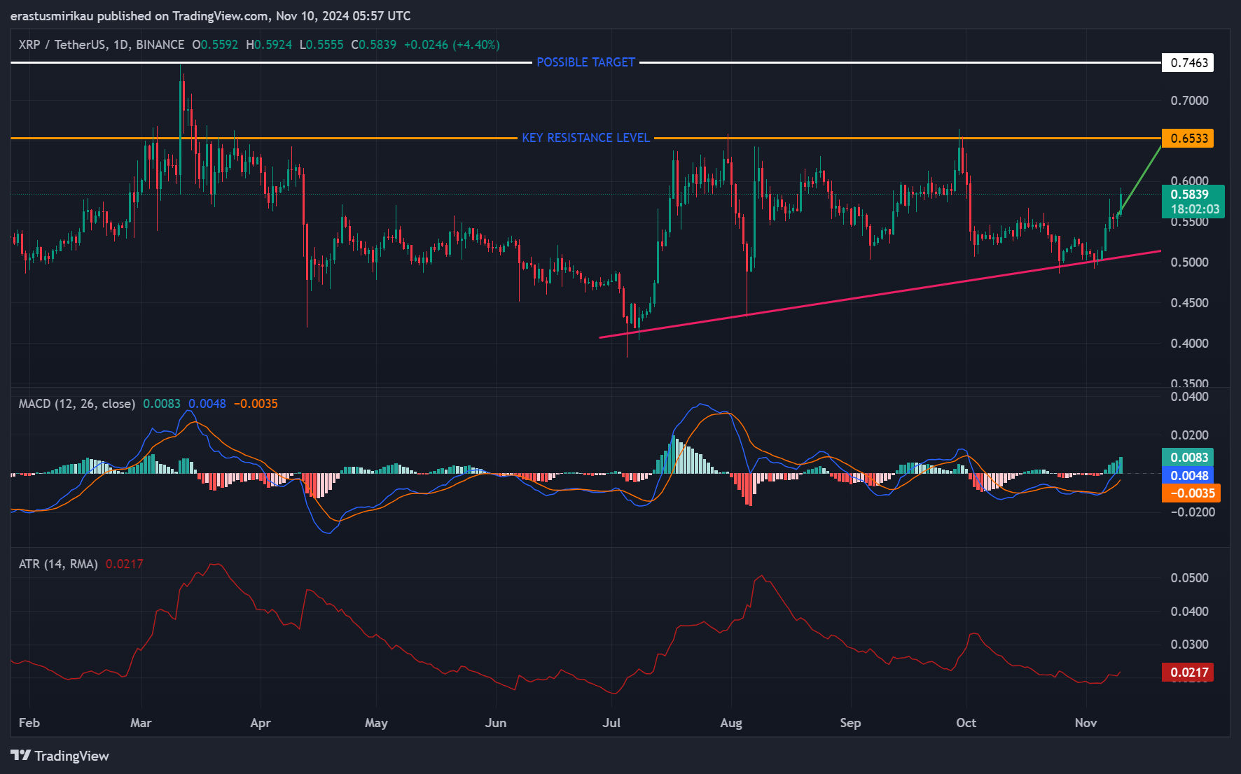 XRP’s price has been on an upward trajectory, closing in on the significant resistance at $0.6533.
