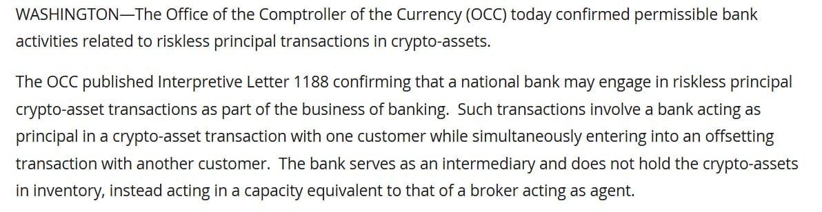 The move came just as the U.S. Office of the Comptroller of the Currency clarified that banks can execute riskless principal crypto trades.