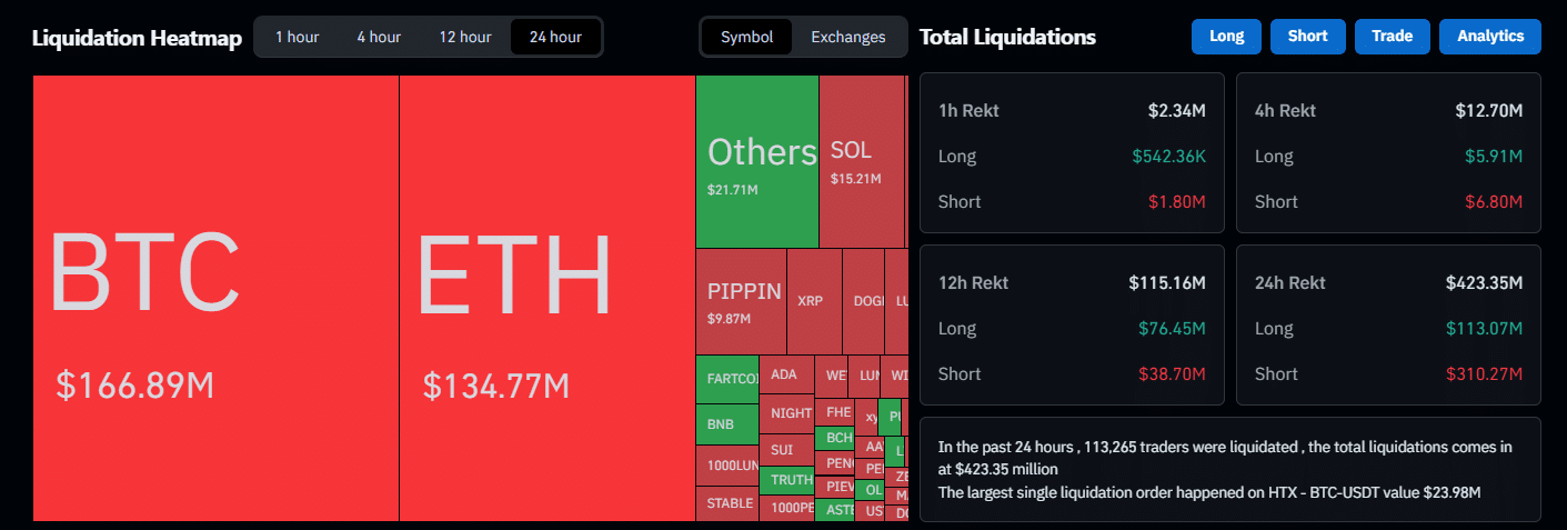 This triggered a massive wave of liquidations, clearing over $423 million in the past 24 hours.